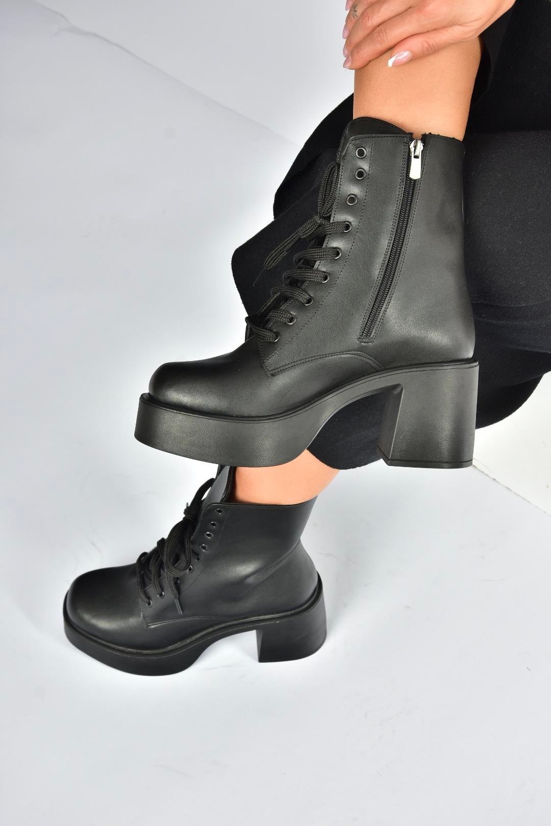 V726681509 Siyah Kalın Topuklu Bağcıklı Kadın Bot