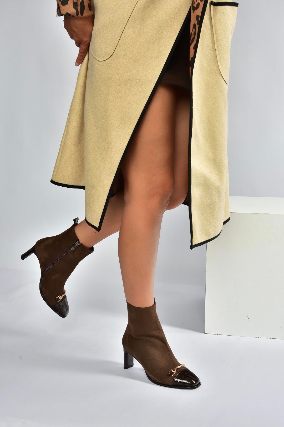 V820284602 Kahverengi Süet Kalın Topuklu Kadın Bot